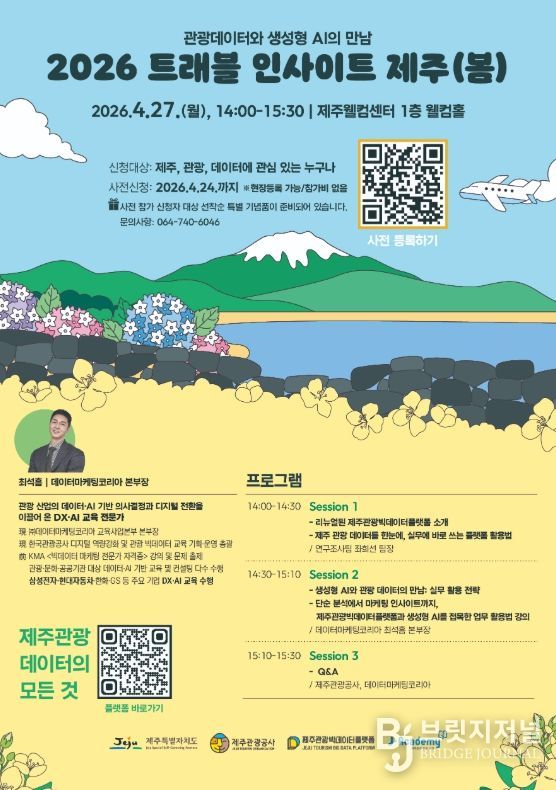 브릿지저널 정보영 기자 | 제주특별자치도와 제주관광공사(사장 고승철)는 오는 27일 제주웰컴센터에서 관광사업체, 공공기관, 학계 등 관광과 데이터에 관심 있는 분들을 대상으로 데이터 기반 의사결정을 지원하기 위한 ‘2026 트래블 인사이트 제주(봄)’ 세미나를 개최한다고 23일 밝혔다. 이번 세미나에선 새롭게 개편한 제주관광 빅데이터 플랫폼(data.ijto.or.kr)의 활용 방안을 소개하고, 생성형 인공지능(AI)과 관광데이터를 결합한 실무 활용 전략을 공유한다.