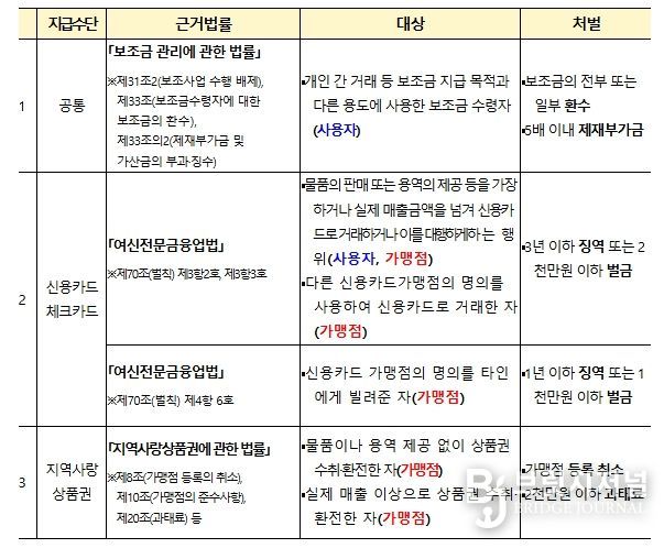 또한, 지역별 ‘부정유통 신고센터’를 운영하여 가맹점을 수시 단속하고 온라인 커뮤니티 등에서 개인 간 거래가 발생하지 않도록 모니터링을 강화해 줄 것을 각 지방정부에 요청했다.