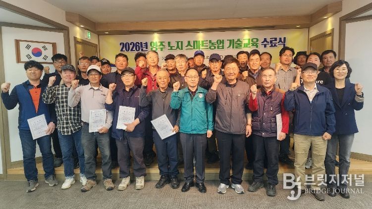 브릿지저널 정보영 기자 | 영주시농업기술센터는 지난 23일 농업체험교육관에서 교육생과 관계자 등 36명이 참석한 가운데 ‘영주 노지 스마트농업 기술교육’ 수료식을 개최했다.