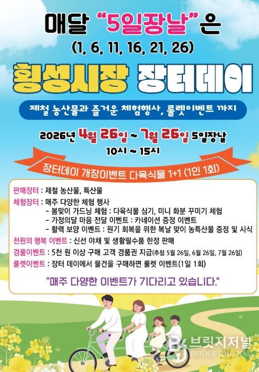 브릿지저널 윤나영 기자 | 횡성군이 전통시장 내 고객 유입을 촉진하고 지역 경제에 활력을 불어넣기 위해 오는 4월 26일부터 7월 26일까지 ‘2026 횡성전통시장 장터데이’ 행사를 개최한다.