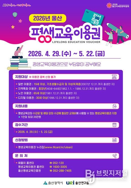 브릿지저널 윤나영 기자 | 울산시가 경제적 여건에 따른 교육격차를 완화하고, 성인의 자아실현을 지원하기 위해 ‘2026년 평생교육이용권 지원사업’의 2차 신청 접수에 나선다.