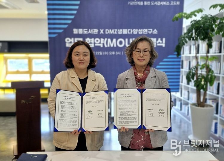 브릿지저널 김경미 기자 | 파주시 월롱도서관은 지난 22일 디엠지(DMZ)생물다양성연구소와 지역사회 독서진흥 및 생태환경 분야 협력을 위한 업무협약을 체결했다.