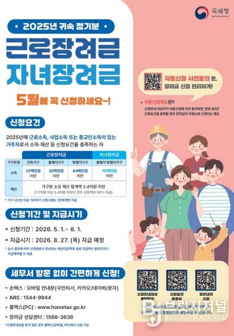 브릿지저널 김경미 기자 | 사천시는 국세청에서 저소득 근로자와 자영업자 가구의 생활 안정을 지원하기 위한 2025년 귀속 근로·자녀장려금 정기 신청을 오는 5월 1일부터 6월 1일까지 접수받는다고 24일 밝혔다.