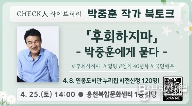 브릿지저널 윤나영 기자 | 홍천 군립 도서관이 오는 4월 25일 오후 2시 홍천 복합 문화센터 1층 강당에서 배우 겸 작가 박중훈을 초청해 2026년 ‘체크인 라이브러리’의 첫 번째 북토크를 개최한다.