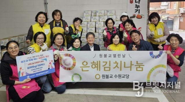브릿지저널 김경미 기자 | 수원시 팔달구 매교동은 지난 22일, 원불교 수원교당(교구장 김도천)으로부터 직접 담근 배추김치(5kg) 100박스를 기부받았다고 밝혔다.
