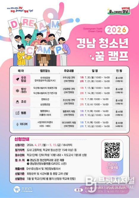 브릿지저널 김경미 기자 | 경상남도는 도내 고등학생과 만 15세 이상 학교밖청소년을 대상으로 4월 27일부터 5월 15일까지 2026년 경남 청소년 꿈 캠프 참가자를 모집한다고 밝혔다.