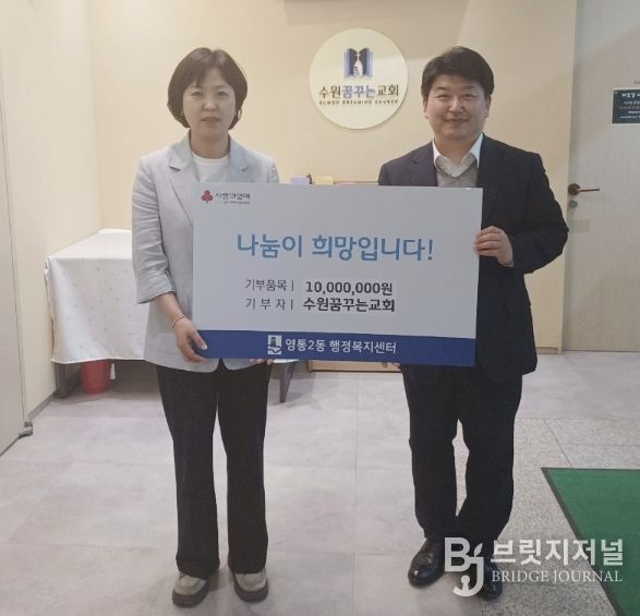브릿지저널 김경미 기자 | 수원시 영통구 영통2동은 지난 23일 수원꿈꾸는교회가 지역사회 내 취약계층 지원을 위해 교인들과 함께 모금한 사랑의 성금 1천만원을 영통2동 행정복지센터에 기부했다고 밝혔다.