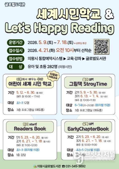 브릿지저널 김경미 기자 | 의왕시 글로벌도서관이 책을 통해 세상을 이해하고 체험하는 다문화 이해 프로그램 '어린이 세계 시민 학교'와 영어 읽기 문해력 향상을 위한 단계별 맞춤 프로그램 'Let’s Happy Reading'의 참여자를 모집한다.