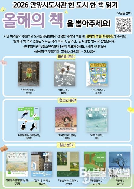 브릿지저널 김경미 기자 | 안양시는 2026년 한 도시 한 책 읽기 ‘올해의 책’ 선정을 위한 시민 선호도 조사를 오는 5월 1일까지 온·오프라인으로 진행한다고 24일 밝혔다.