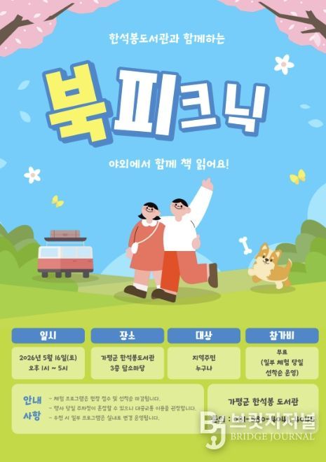 브릿지저널 김경미 기자 | 가평군은 5월 가정의 달을 맞아 오는 16일 한석봉도서관 3층 담소마당에서 ‘가족과 함께하는 북 피크닉’ 행사를 개최한다고 밝혔다.