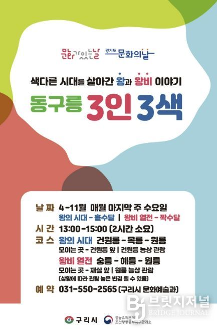 브릿지저널 김경미 기자 | 구리시는 4월부터 11월까지 세계문화유산 동구릉에서 매월 마지막 주 수요일 ‘문화가 있는 날’을 맞아 ‘동구릉 3인 3색 해설 프로그램’을 운영한다고 밝혔다.