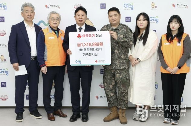 브릿지저널 김경미 기자 | 가평군 자원봉사센터 가족봉사단은 23일 가평군청 군수실에서 이웃돕기 성금 기탁 전달식을 가졌다. 이날 행사에는 서태원 가평군수를 비롯해 연기복 가족봉사단 회장, 이명열 가평군 자원봉사센터장 등이 참석했다.