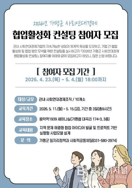 브릿지저널 김경미 기자 | 가평군이 사회연대경제 조직 간 협업 활성화를 위해 ‘2026년 사회연대경제 협업활성화 컨설팅’을 추진하고, 참여 조직을 5월 4일까지 모집한다.
