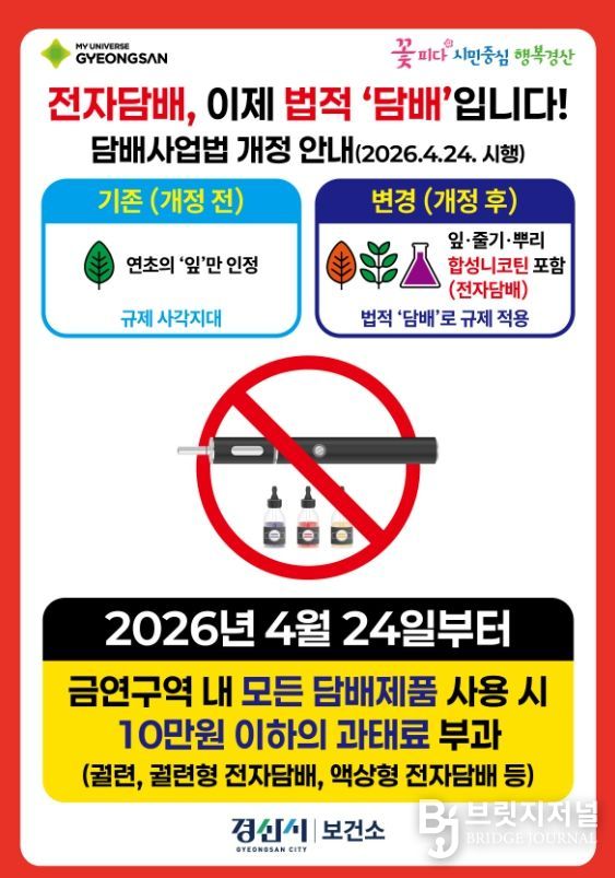 브릿지저널 정보영 기자 | 경산시는 4월 24일부터 5월 15일까지 3주간 경산시보건소, 일자리경제과, (사)한국외식업중앙회 경산시지부와 함께 담배사업법 개정에 따른 법령 준수 정착을 위해 금연 구역 내 흡연 행위에 대한 집중 지도와 점검을 실시한다.