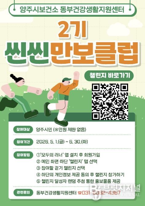 브릿지저널 김경미 기자 | 양주시보건소 동부 건강생활지원센터에서 지역 주민의 건강생활실천율 향상과 비만율 개선을 위해 ‘2026년도 씬씬 만보클럽 2기’ 참여자를 모집한다.