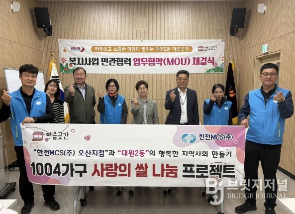 브릿지저널 김경미 기자 | 오산시 대원2동 행정복지센터와 대원2동 지역사회보장협의체는 지난 22일 한전MCS(주) 오산지점과 지역 내 취약계층 지원을 위한 복지업무협약을 체결하고, ‘1004가구 사랑의 쌀 나눔 프로젝트’ 추진을 위한 발대식을 개최했다고 밝혔다.