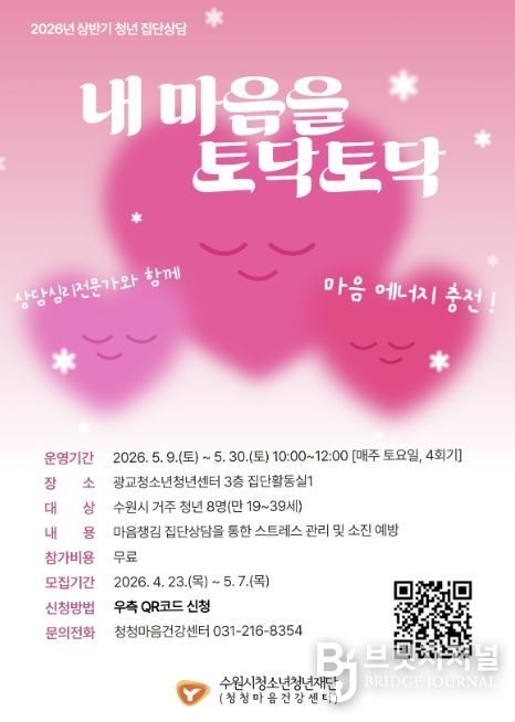 브릿지저널 김경미 기자 | 수원시청소년청년재단 청청마음건강센터는 학업과 취업준비, 직장생활 등 경쟁 중심 환경으로 인해 심리적 소진을 겪는 관내 청년들을 대상으로, 오는 5월 7일까지 전문가가 참여하는 집단상담 프로그램 ‘내 마음을 토닥토닥’ 참가자를 모집한다고 밝혔다.