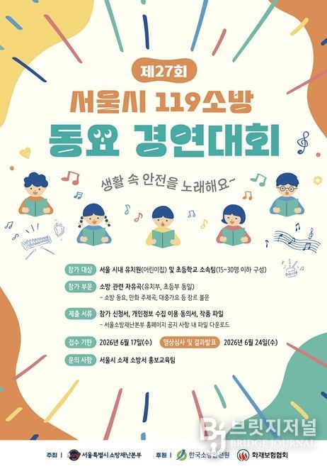 브릿지저널 김경미 기자 | 서울시 소방재난본부는 '제27회 서울시 119소방동요 경연대회' 참가팀을 6월 17일까지 모집하고, 접수된 작품 심사를 거쳐 우수팀을 선정할 계획이라고 24일 밝혔다.