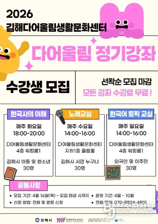 브릿지저널 김경미 기자 | (재)김해문화관광재단 문화도시팀 김해다어울림생활문화센터는 지역 주민의 역량 강화와 문화 향유 기회 확대를 위해 ‘2026 다어울림 정기강좌’를 개설하고 본격적인 운영에 들어간다고 밝혔다.