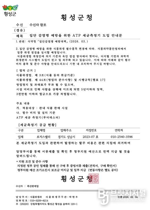 횡성군에 따르면, ‘ATP 세균측정기’ 등 식품위생 장비 도입을 안내하는 것처럼 위장한 허위 공문이 일부 식품영업자에게 발송되고 있다.