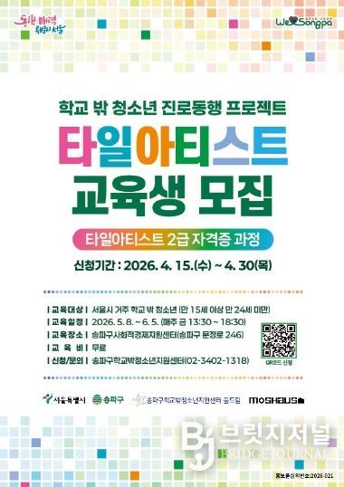 브릿지저널 김경미 기자 | 송파구는 서울시 ‘약자와의 동행’ 공모사업으로 학교 밖 청소년들의 사회진입과 자립을 돕기 위한 ‘타일아티스트 교육’을 실시한다고 24일 밝혔다.