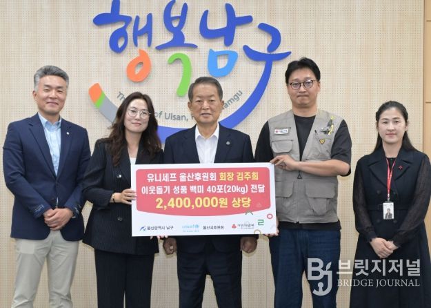 브릿지저널 윤나영 기자 | 유니세프 울산시후원회(회장 김주희)는 24일 남구청을 방문해 관내 저소득층 지원을 위한 백미(20kg) 40포를 전달했다.