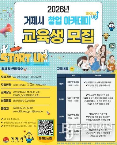 브릿지저널 김경미 기자 | 거제시는 지역 내 예비 창업자와 일반 시민이 일상 속 아이디어를 창업 으로 구현해볼 수 있도록 돕는'2026년 거제시 창업 아카데미' 교육생을 오는 4월 27일부터 모집한다.