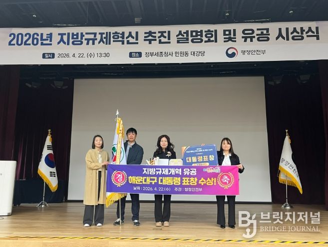 브릿지저널 윤나영 기자 | 해운대구는 행정안전부 주관‘2025년 지방규제혁신 추진 성과평가’에서 우수한 성과를 인정받아 지난 22일 지방규제개혁 유공 대통령 표창을 수상하였다.