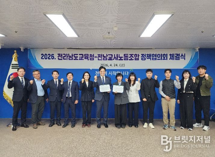 브릿지저널 김경미 기자 | 전라남도교육청과 전남교사노동조합(위원장 김신안)은 24일 전라남도교육청 중회의실에서 ‘2026년도 정책협의회 체결식’을 갖고, 건강한 교육 생태계 조성을 위한 공동의 노력을 약속했다.