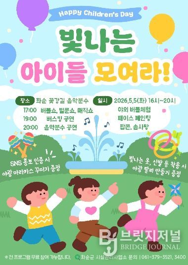 브릿지저널 김경미 기자 | 화순군은 오는 5월 5일 오후 4시부터 밤 8시까지 꽃강길 음악분수대에서 어린이날 특별 행사 ‘빛나는 아이들 모여라’를 개최한다고 밝혔다.