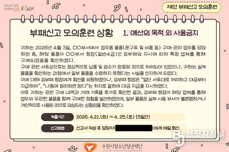 브릿지저널 김경미 기자 | 수원시청소년청년재단은 임직원의 부패 상황 인지 및 신고 역량을 강화하고 조직 내 청렴문화를 확산하기 위해 '2026년 부패신고 모의훈련'을 실시했다고 밝혔다.