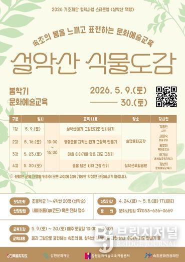 이태훈 사무국장은 “설악산 식물도감을 통해 우리 지역 어린이들이 수려한 자연환경 속에서 글과 그림으로 봄이라는 계절을 자유롭게 표현해 보는 경험을 하길 기대한다”며 “지역적 요구에 부응하는 지역 특성화 문화예술교육 시스템 구축을 위해 강원특별자치도, 강원문화재단, 강원문화예술교육지원센터와 함께 지속적으로 확대해 나가겠다”고 밝혔다.