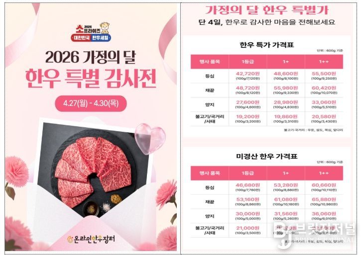 브릿지저널 김경미 기자 | 농림축산식품부는 가정의 달을 맞아 한우자조금, 전국한우협회, 농협경제지주와 협력하여 4월 27일부터 5월 10일까지 14일 동안 농축협 하나로마트, 대형마트 및 주요 온라인몰 등에서 ‘소(牛)프라이즈 대한민국 한우고기 할인행사’를 실시한다고 밝혔다.