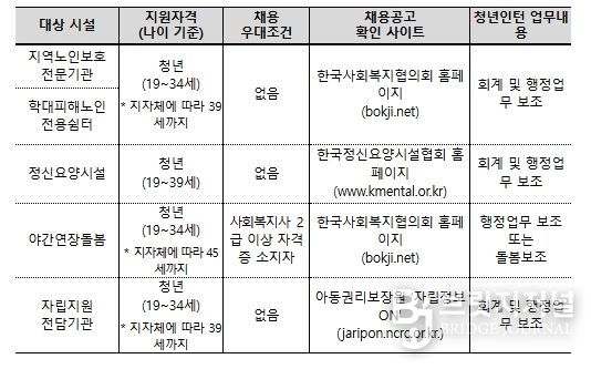 이번 모집을 통해 선발되는 479명의 청년인턴은 전국 아동·노인·정신요양 시설 등 5개 유형의 시설에서 근무하게 된다.