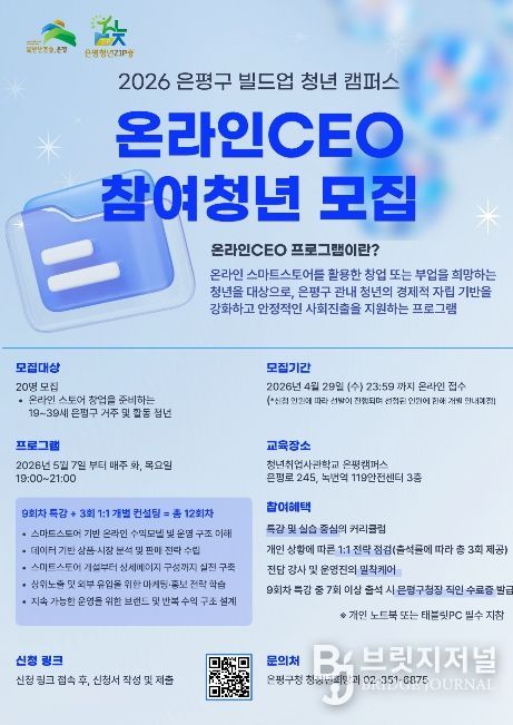 브릿지저널 김경미 기자 | 서울 은평구는 온라인 스토어 창업·부업을 준비하는 청년을 대상으로 ‘온라인CEO’ 프로그램 참여자를 이달 29일까지 모집한다고 밝혔다.