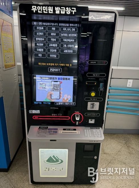 브릿지저널 김경미 기자 | 서울 강북구는 구민들이 무인민원발급기를 더욱 쉽고 편리하게 이용할 수 있도록 ‘큐알(QR)코드 모바일 가이드’를 전격 도입했다고 밝혔다.