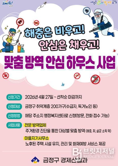 브릿지저널 윤나영 기자 | 부산 금정구는 관내 취약계층의 쾌적하고 안전한 주거 환경 조성을 위해 ‘맞춤 방역 안심하우스’ 사업을 추진하고, 오는 4월 27일부터 대상 가구를 모집한다고 밝혔다.
