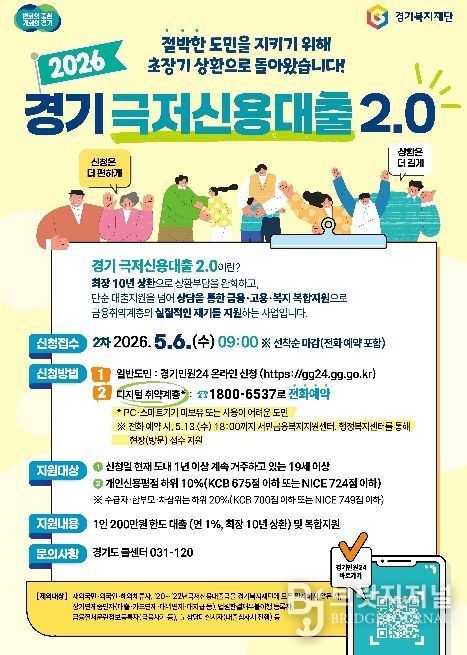 브릿지저널 김경미 기자 | 경기도가 5월 6일 오전 9시부터 금융취약계층의 생활 안정을 지원하는 ‘경기 극저신용대출 2.0’ 2차 접수를 시작한다.