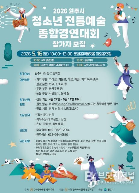 브릿지저널 윤나영 기자 | 사단법인 한국예술문화단체총연합회 원주지회는 오는 5월 개최되는 ‘제30회 원주 청소년 예술제’를 앞두고, 무대의 주인공이 될 지역 청소년 참가자를 모집한다.
