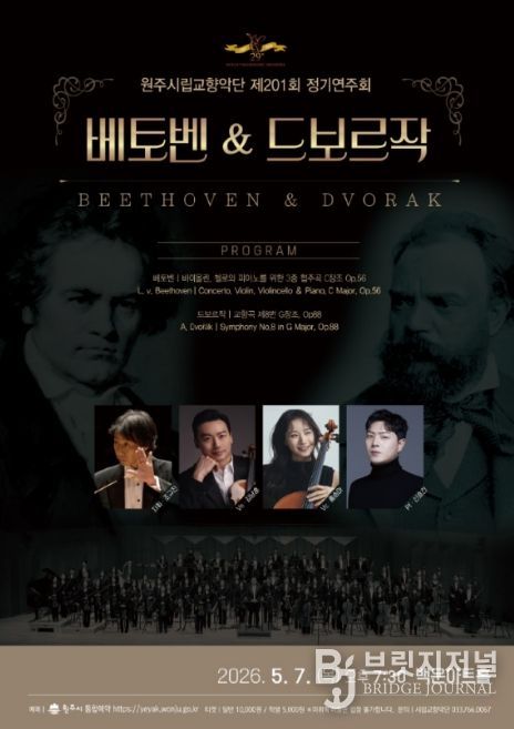 브릿지저널 윤나영 기자 | 원주시립교향악단 제201회 정기연주회가 오는 5월 7일 오후 7시 30분 백운아트홀에서 개최된다. 이번 연주회에는 지휘자 조규진과 바이올리니스트 김남훈, 첼리스트 홍승아, 피아니스트 신효건이 협연자로 나서 베토벤 3중 협주곡 C장조와 드보르작 교향곡 제8번 G장조를 선보일 예정이다.