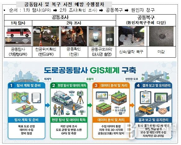 조사에는 최첨단 지표투과레이더(GPR) 장비가 활용된다. 해당 장비는 전자기파를 지중으로 발사해 되돌아오는 신호를 분석하는 방식으로, 굴착 없이도 지하 시설물의 상태와 공동의 유무 및 규모를 파악할 수 있다.