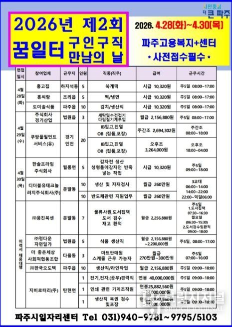브릿지저널 김경미 기자 | 파주시는 오는 28일부터 30일까지 파주고용복지플러스센터(금촌동 엠에이치(MH)타워 8층)에서 2026년 제2회 ‘구인·구직 만남의 날’을 개최한다.
