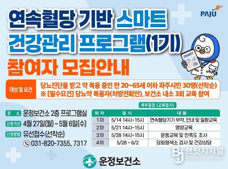 브릿지저널 김경미 기자 | 파주시 운정보건소는 심뇌혈관질환 예방관리사업의 일환으로 ‘연속혈당 기반 스마트 건강관리 프로그램’참여자를 오는 27일부터 10일간 모집한다.