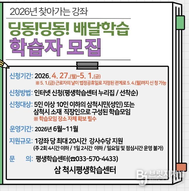 브릿지저널 윤나영 기자 | 삼척시는 4월 27일부터 5월 4일까지 ‘2026년 찾아가는 강좌 '딩동! 딩동! 배달학습'’ 참여 학습자를 모집한다고 밝혔다.