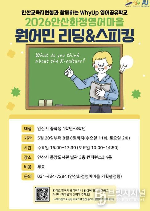 브릿지저널 김경미 기자 | 안산시가 설립하고 안산대학교가 운영하는 안산화정영어마을은 경기도안산교육지원청과 협력해 관내 중학생을 대상으로 ‘제2회 원어민 리딩·스피킹 프로그램’을 운영하고 참가자를 모집한다고 27일 밝혔다.