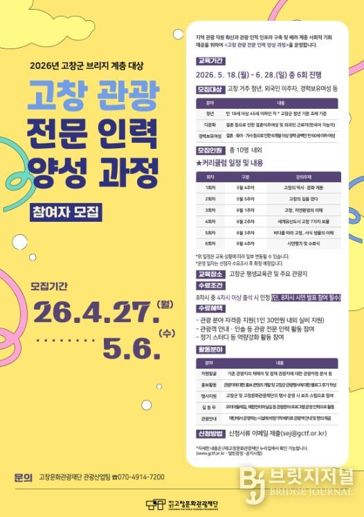 브릿지저널 윤나영 기자 | 고창문화관광재단은 27일부터 지역 관광 활성화 및 수용태세 개선을 위해 ‘2026년 관광 전문인력 양성사업’ 참여자를 모집한다고 밝혔다.