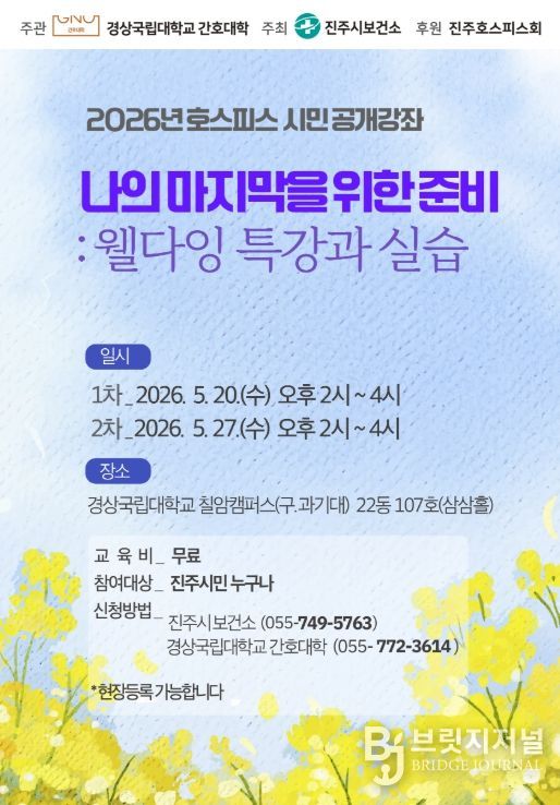 브릿지저널 김경미 기자 | 진주시와 경상국립대 간호대학은 ‘나의 마지막을 위한 준비’를 주제로 오는 5월 20일과 5월 27일 경상국립대 칠암캠퍼스(옛. 경남과학기술대) 22동 107호(삼삼홀)에서 ‘호스피스 시민 공개강좌’를 실시한다.