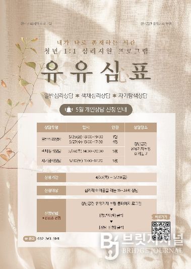 브릿지저널 김경미 기자 | 부평구 청년공간 유유기지 부평은 청년 심리지원 프로그램 ‘유유심(心)표’ 5월 참여자를 모집한다.