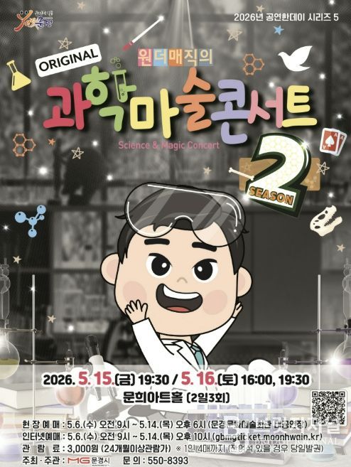브릿지저널 정보영 기자 | 문경문화예술회관에서는 5월 어린이 달을 맞아 마술과 과학의 경계를 넘나들며 온가족 모두가 재미있게 관람할 수 있는 과학마술콘서트 시즌2 공연을 5월 15일 19:30, 16 16:00, 19:30 (2일 3회)에 문희아트홀에서 개최한다.