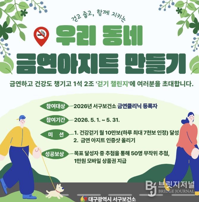 브릿지저널 김진석 기자 | 대구 서구보건소는 금연 시도자들이 일상에서 즐겁게 목표를 달성할 수 있도록 금연 실천과 신체 활동을 결합한 ‘우리 동네 금연 아지트 만들기’ 챌린지를 오는 5월부터 10월까지 본격 운영한다고 밝혔다.